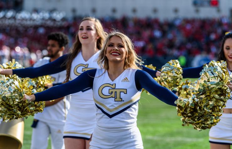 A former Georgia Tech cheerleader, Broussard found her passion for graphic design while helping to manage the team’s social media account. She changed her major from computational media to literature, media, and communication, and when she stepped onto the field one Saturday and saw her design being worn by students in Bobby Dodd Stadium at Hyundai Field, she knew she’d found her path.